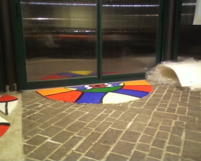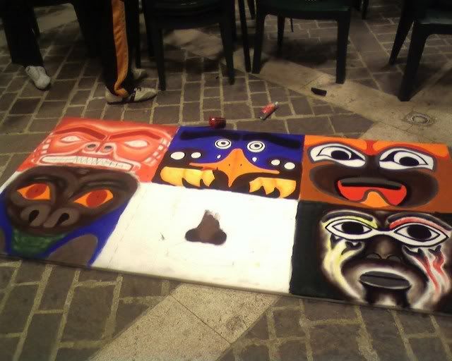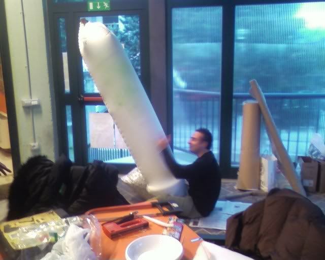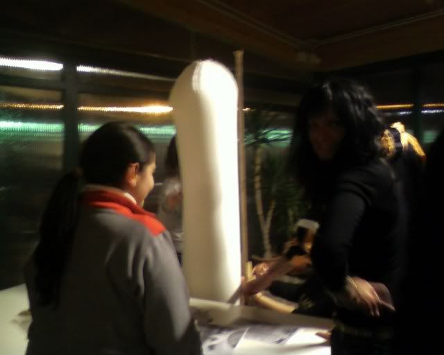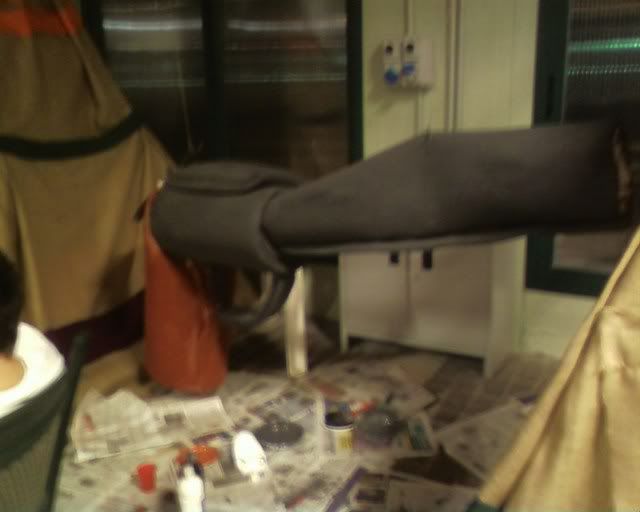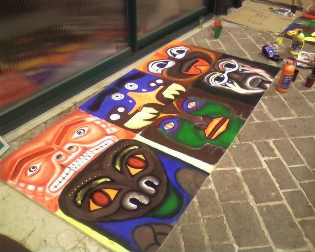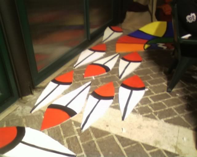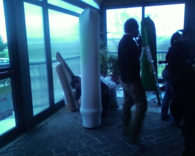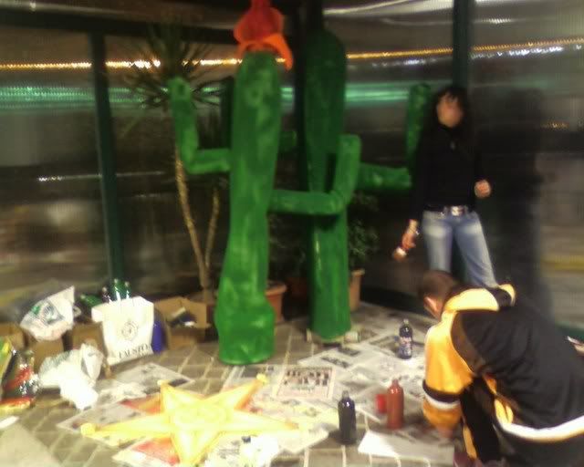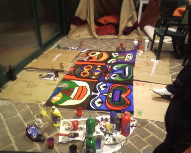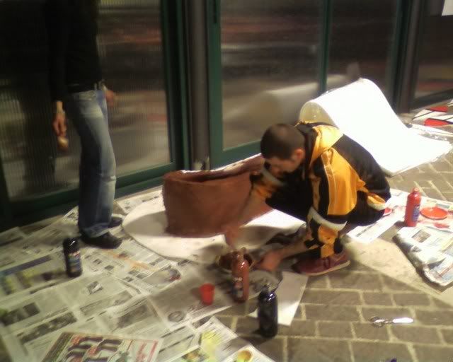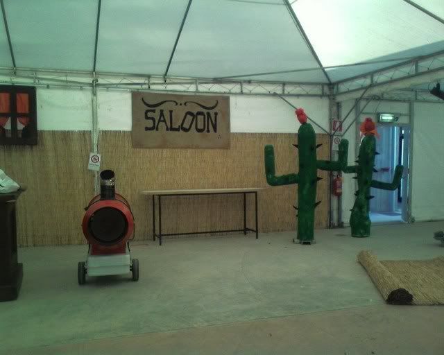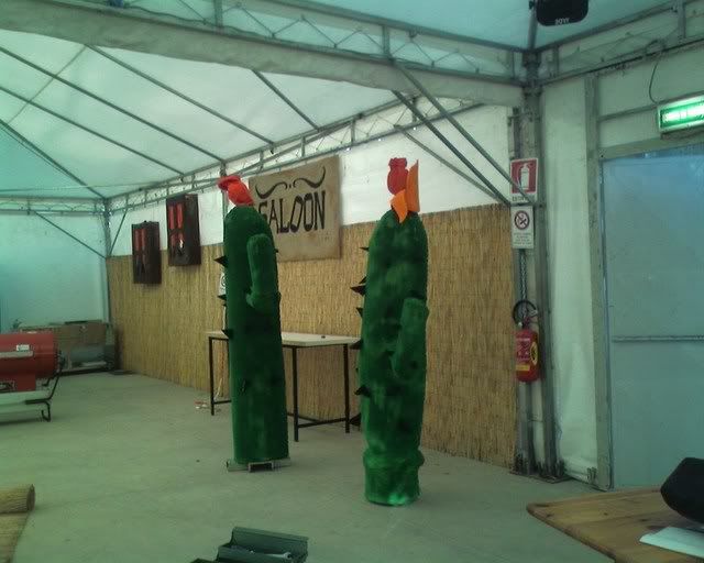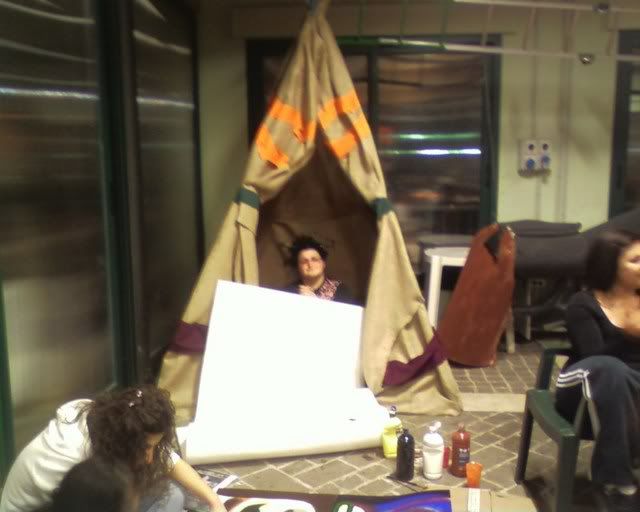 Did not take pictures the following day - we did (and painted) cardboard wings for the totem's top, together with a brown strip of (surprise surprise) more foam rubber. Apparently, spending a, er, little while in the tensile structure to sew the totem together wearing just a long sleeved top was not my brightest idea. (God, by the time I was done my fingers where falling off.) Margherita thinks I might be in menopause already. :P Marta (the girl on the right of the first photo) did the Saloon sign on the jute we had left, while Elisa and Cecilia did a couple of polystyrene windows to hang behind the bar.