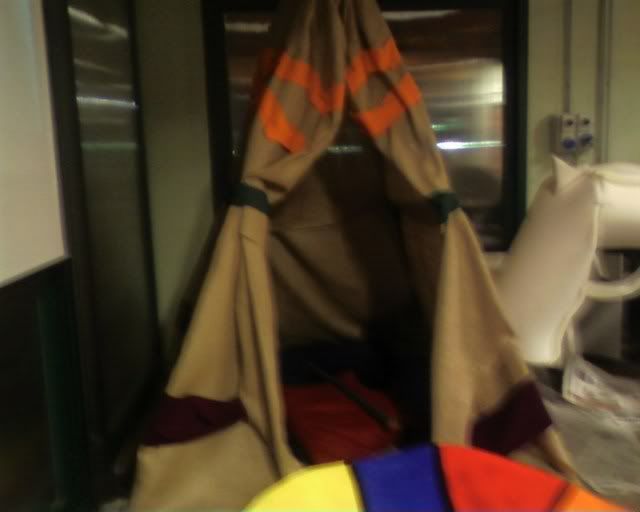 ![]() | Barbara, seated in one of the tents and using the remaining sheet of foam rubber as a blanket. |